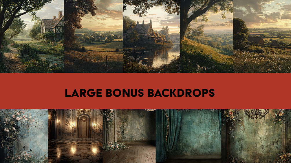 The collection includes muted tone curtains and veils that subtly enhance your subject without drawing attention away from the main image. As a bonus, you’ll find 1980s England landscape backgrounds, along with detailed digital wall element backgrounds, giving you more variety for your compositions.